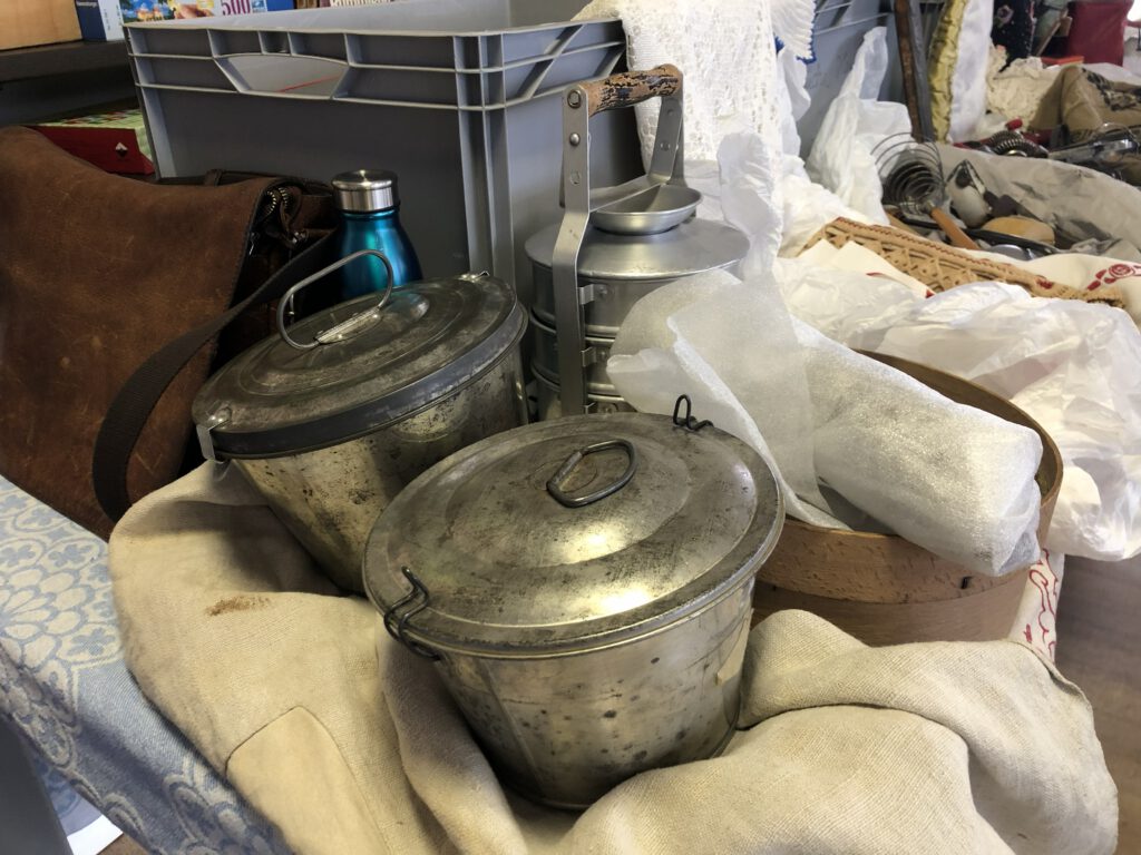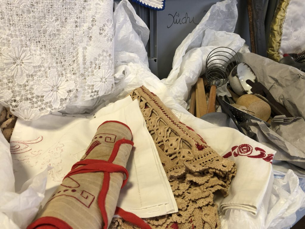emaillierte Milchkannen, schwere gusseiserne Pfannen, hölzerne Kochlöffel, Kaffeemühlen und Geschirrtücher mit zarten Stickereien. Viele dieser Utensilien stammten noch von ihrer Großmutter und trugen sichtbare Spuren des früheren Küchenlebens.