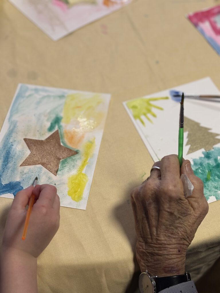 Obwohl unsere Gäste sonst eher nicht zu den begeisterten Bastlern zählen, ließen sie sich von der Motivation und Freude der Kinder anstecken. Mit viel Geduld, Kreativität und gegenseitiger Unterstützung entstanden viele individuelle Karten. Am Ende hatte jede und jeder mindestens eine Weihnachtskarte gestaltet – einige Kinder sogar mehrere.